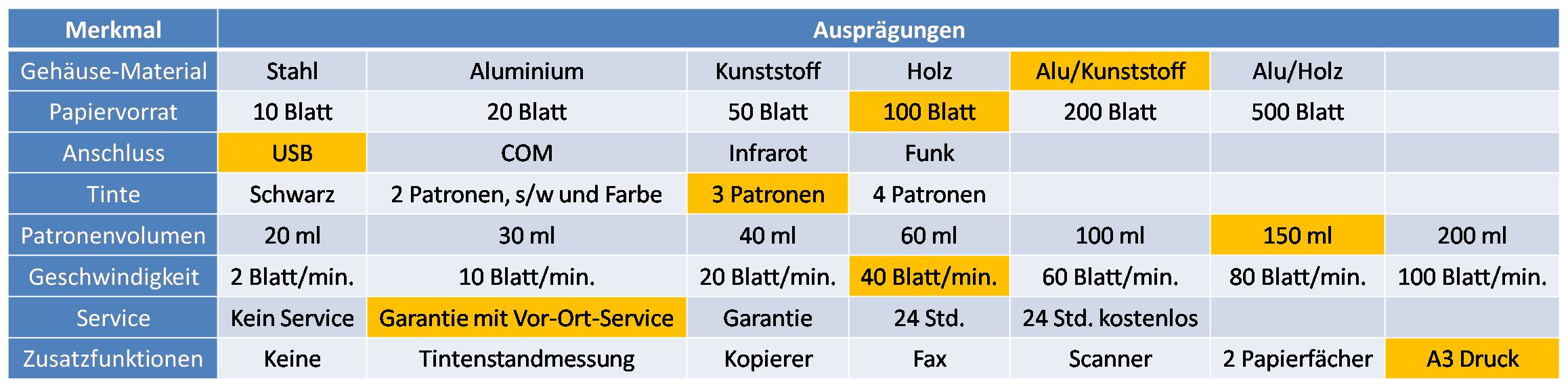 Einzelne Lösungsansätze ergeben sich dann in der Auswahl exakt einer Wertausprägung je charakteristischer Eigenschaft. Der Bezug zur Problemstellung sollte dabei immer im Auge behalten werden. Für einen innovativen Drucker wäre beispielsweise die folgenden Kombination (orange hinterlegt) eine mögliche Lösung: