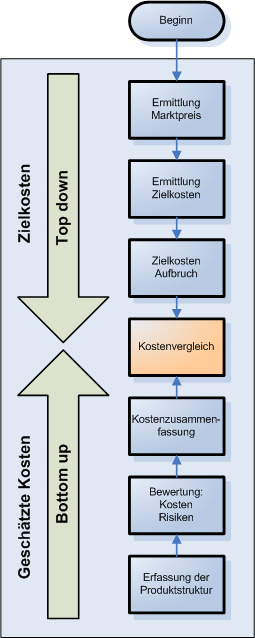 Es werden Marktuntersuchungen durchgeführt, mit dem Ziel, einen potenziellen Marktpreis sowie das wahrscheinliche Umsatzvolumen für das neue Produkt zu bestimmen. Aus diesen Marktdaten werden unter Berücksichtigung der angestrebten Rendite die maximalen Herstellkosten für das Produkt ermittelt. Diese werden als Zielkosten oder auch Target Costs bezeichnet und auf die Teile und Baugruppen des Produktes sowie den Materialflussprozess heruntergebrochen.