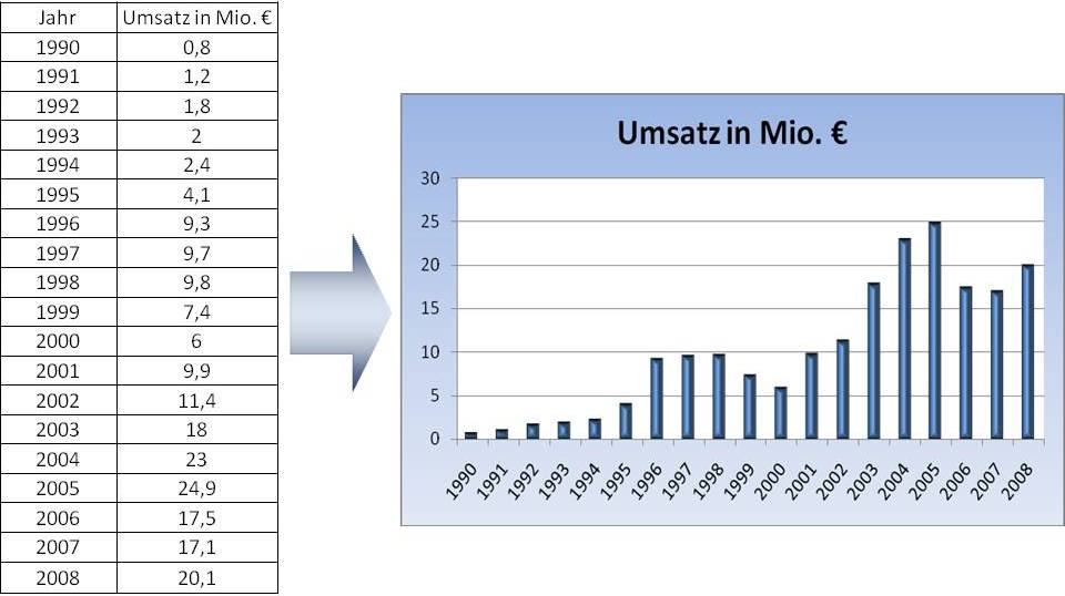 Beispiel: Auf dem unten stehenden Diagramm erkennt man auf einem Blick die schwankende Umsatzentwicklung der vergangenden Jahre. In der Tabelle hingegen werden diese Schwankungen erst auf den zweiten Blick ersichtlich:
